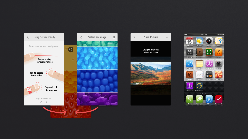 I developed Screen Candy from the ground up in Objective-C and created a layered, multi-directional view manager with a premium feel. To improve the usability and value of the app, I developed an in-app home screen preview, photo editor, and gesture based UI. All of the final patterns were created with Adobe Illustrator and applied to a variety of companion products sold on Society6. Finally, I created screencandyapp.com, as well as all marketing materials used to promote its release.